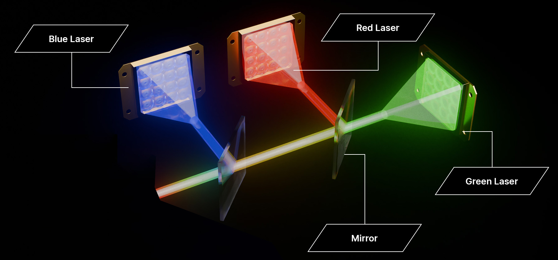 The laser source is straightforward: three laser diodes (Red, Green, Blue) are combined through dichroic mirrors to create arbitrary colors: