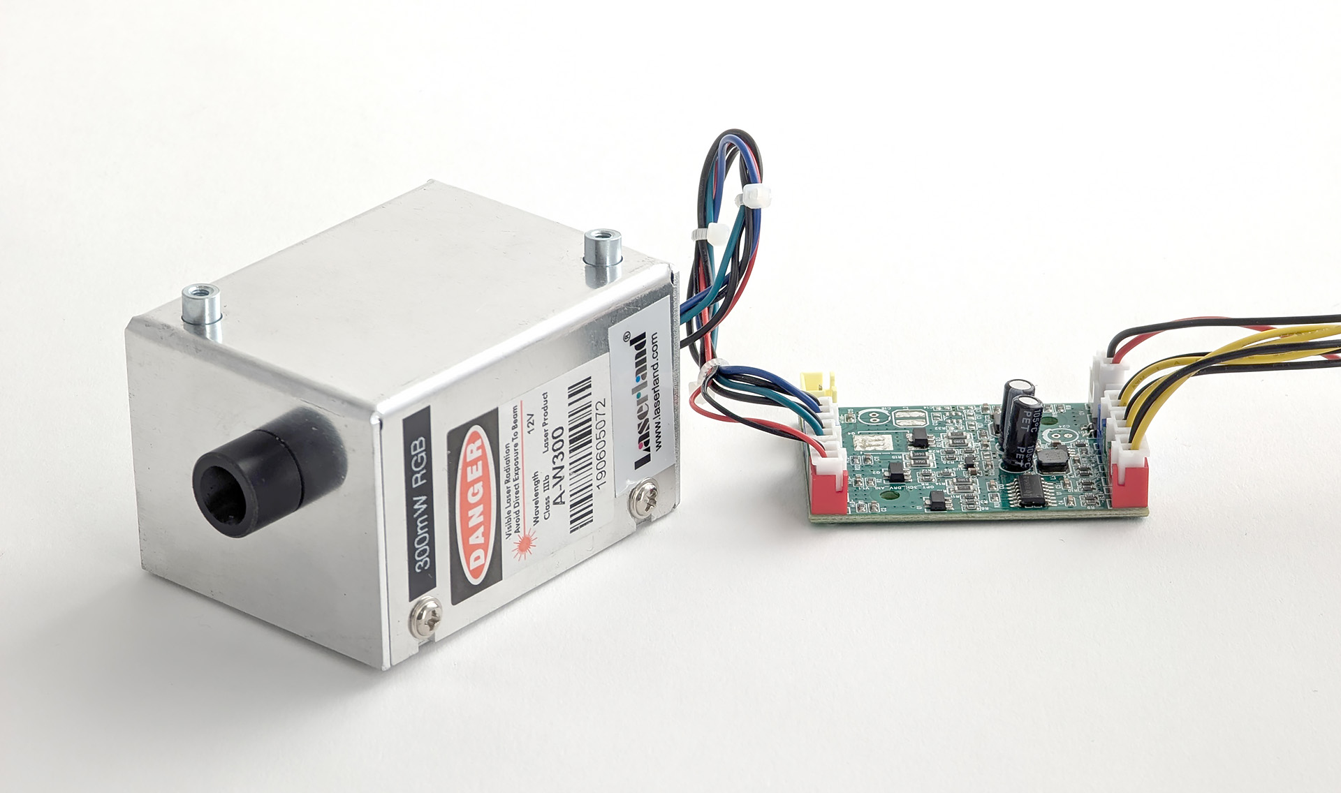 Once again I surveyed what China had to offer on the cheap end of things. Laser pointers of dubious quality (and power ratings) were available, but they weren’t powerful enough for this project. Even if I had looked for higher power red, green, and blue laser diodes I would still have needed to build all the supporting optics for combining the three laser beams to make arbitrary colors. Once again the users at the LaserPointerForum came to the rescue: Laserland sells an all-in-one RGB laser module with sufficient power (300mW total) at a reasonable price: