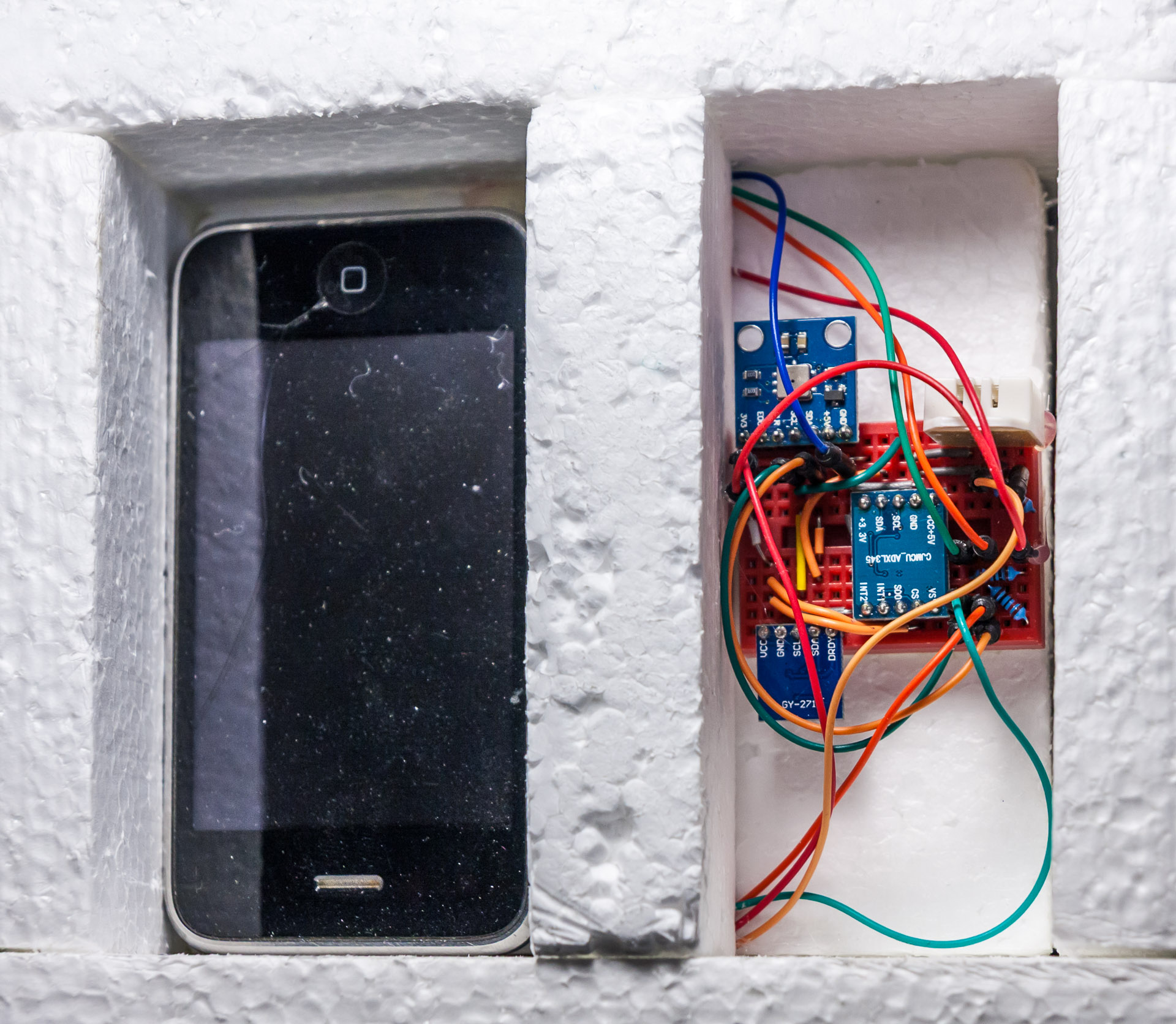 The sensor modules need to be exposed to atmosphere, so they will be housed outside the isolated compartment. So will the phone which needs cell reception in order to provide us with GPS coordinates.