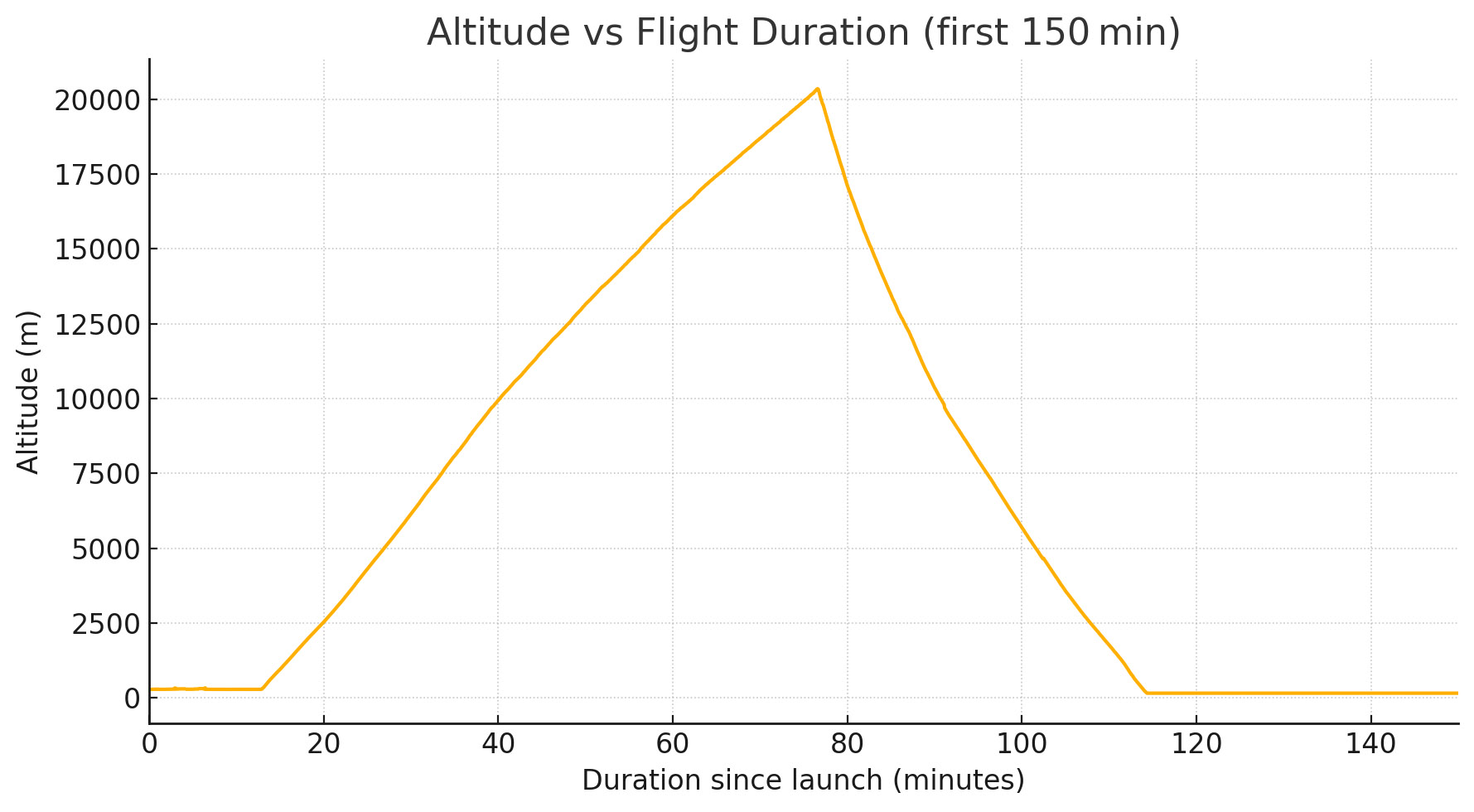 The balloon reached a maximum altitude of 66,000ft (20,140m), taking 1h4m to ascend and 37m to descend. This is short of our design goal of 90,000ft, which means the balloon was overinflated at launch.
